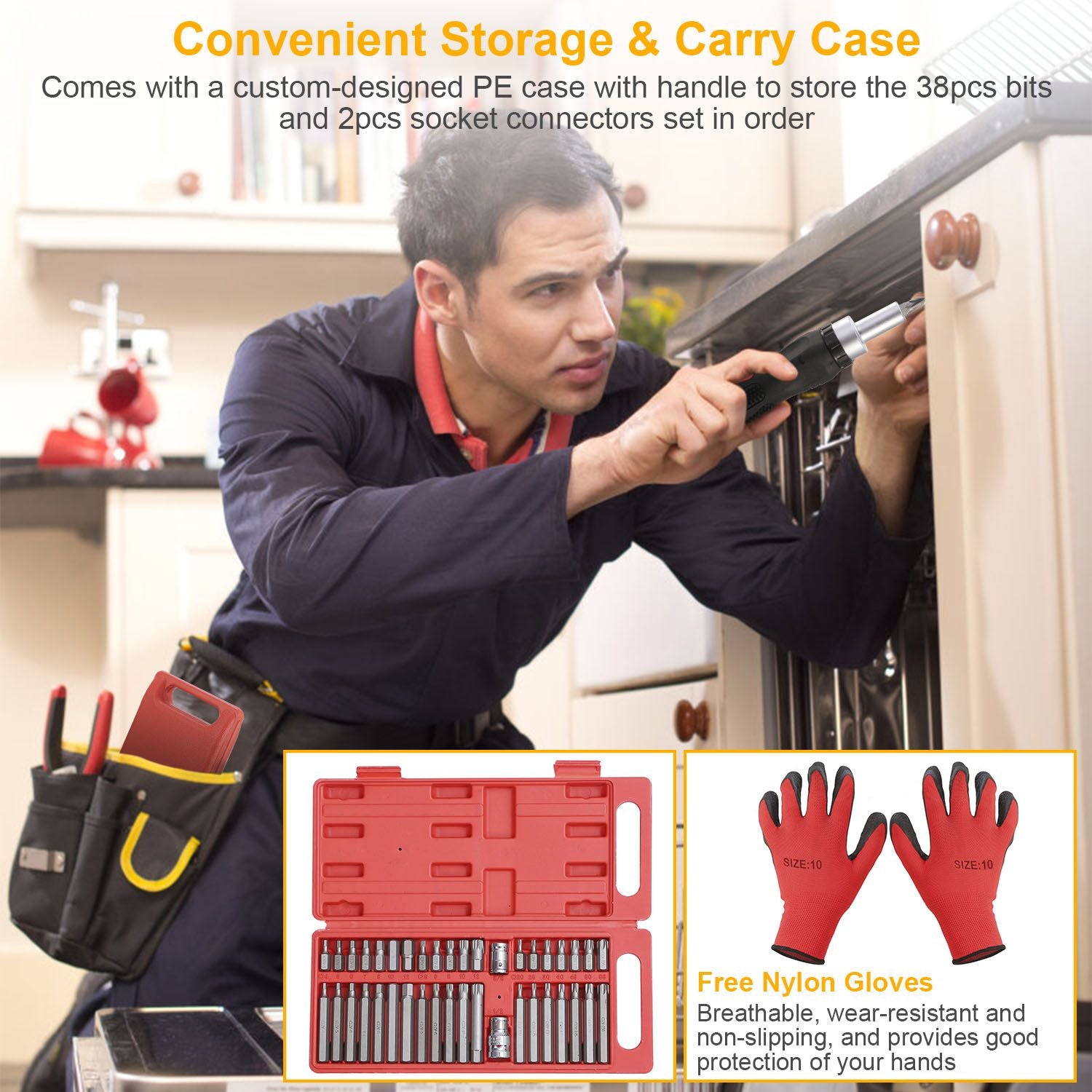 40Pcs Socket Bit Set Hex Torx Spine CRV Combination Bits w/ 3/8"1/2" Drive Free Gloves Case