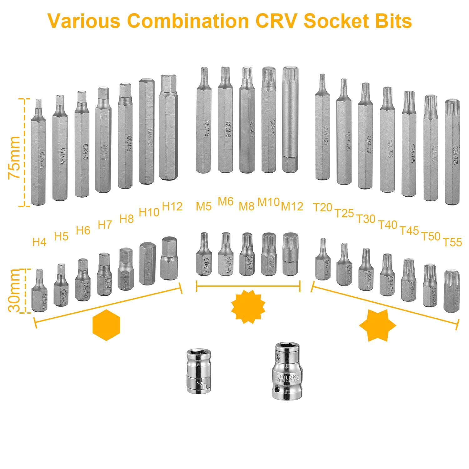 **VARIOUS HEX,TORX AND SPLINE BITS*:Our combination bits include 7pcs 30mm and 7pcs 75mm Torx bits(T20,T25,T30,T40,T45,T50 and T55),7pcs 30mm and 7pcs 75mm Hex bits(4,5,6,7,8,10 and 12mm),and 5pcs 30mm and 5pcs 75mm Spline bits(M5,M6,M8,M10 and M12) to meet different needs.