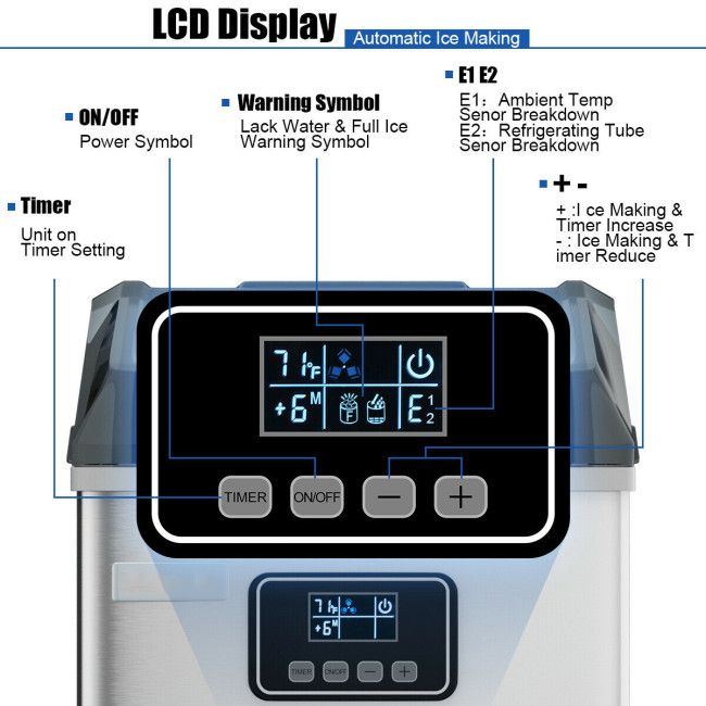 Intelligent LCD Display Panel: The ice machine will quickly respond to your every tap of the corresponding button on the operation area. The warning symbol on the display area will remind you in time when there is a lack of water or the ice basket is full