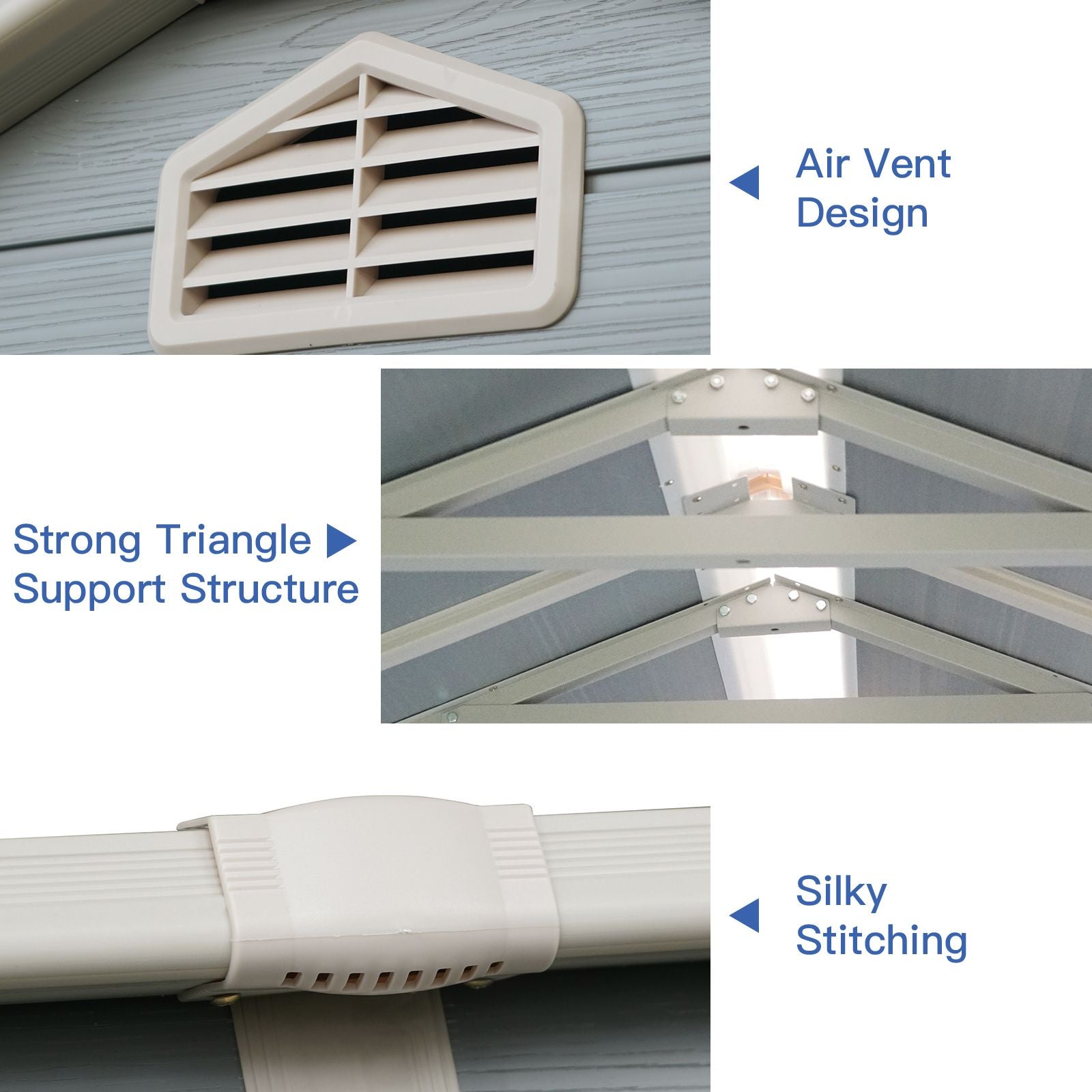 HEAVY-DUTY CONSTRUCTION: This storage shed is made of 0.6mm thick galvanized steel frameMade of 14mm polypropylene double-layer extruded board. Metal reinforced, multi-wall resin panels provide water resistance and UV protection for all-weather durability, while the reinforced resin floor withstands heavy loads.