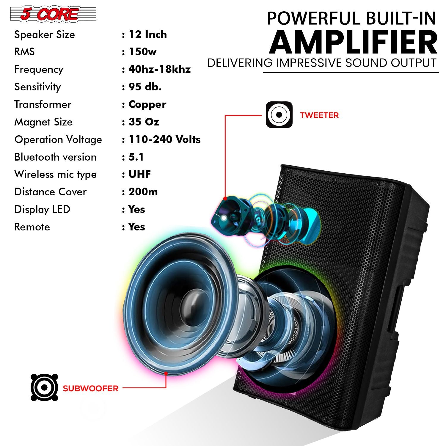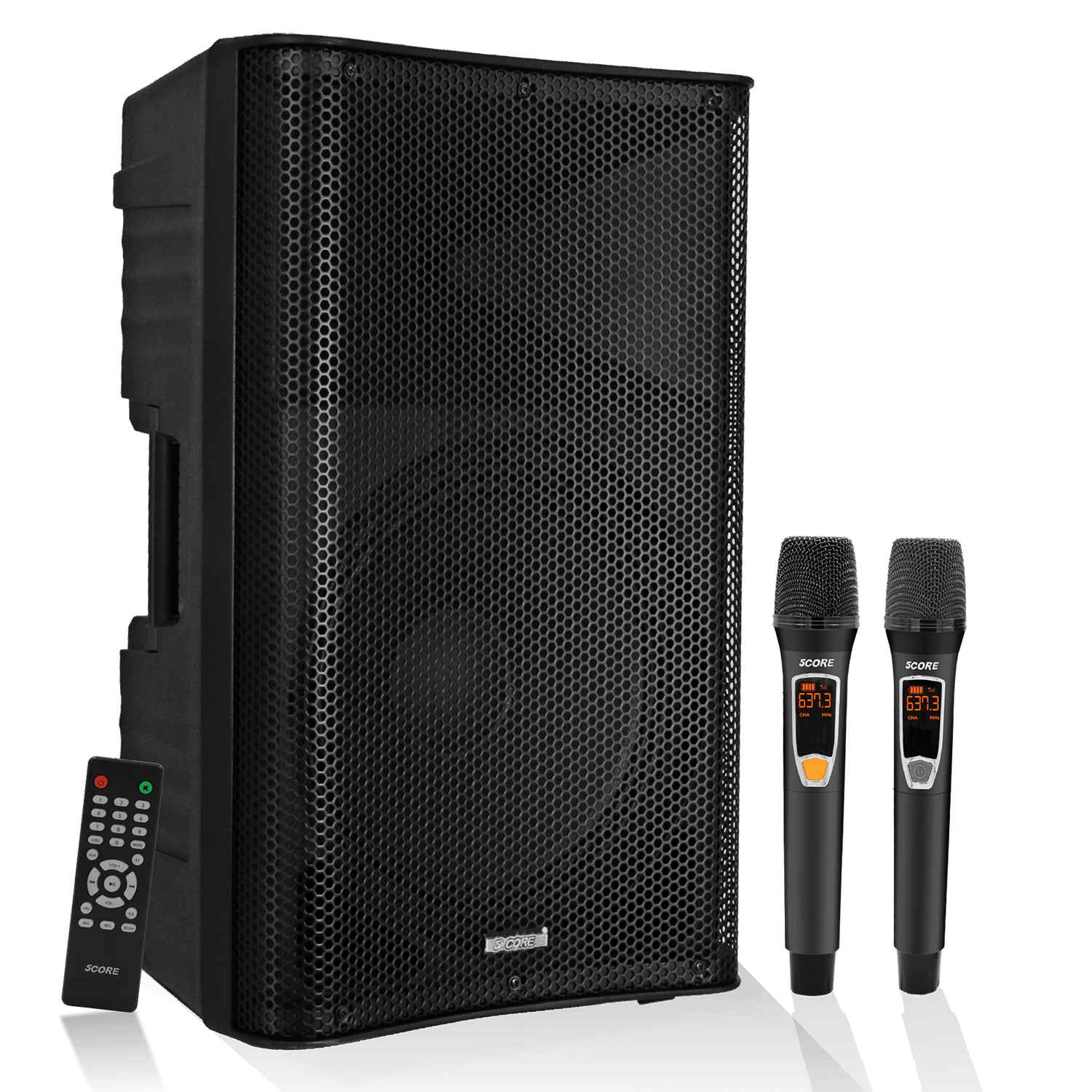 5 Core 12 Inch Bluetooth DJ Speakers Powered 500 Watt Professional Portable PA System 2 Way TWS Bluetooth Speaker with 2 UHF Wireless Microphone Indoor Outdoor Sound Set for Party Active DJ 12 2-MIC