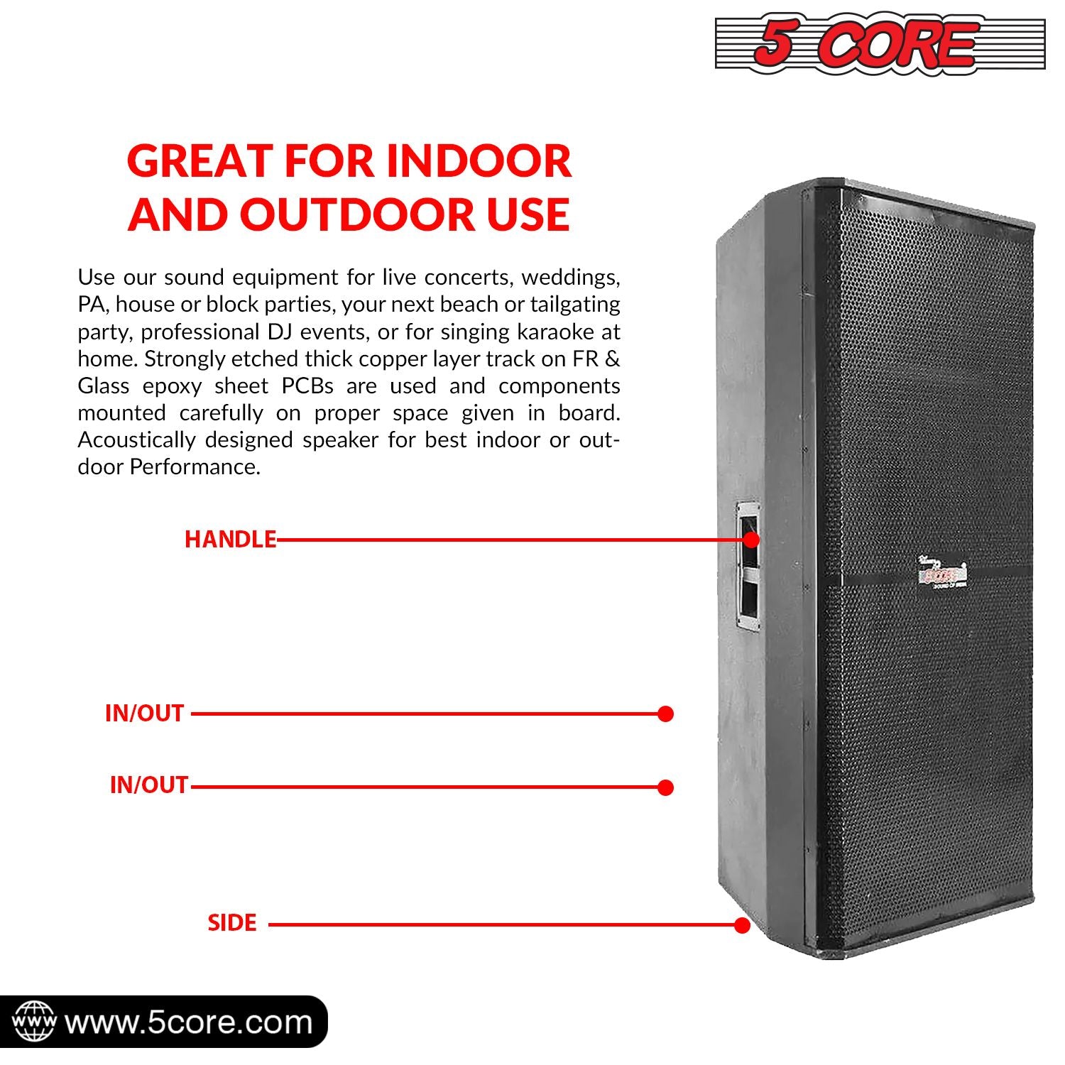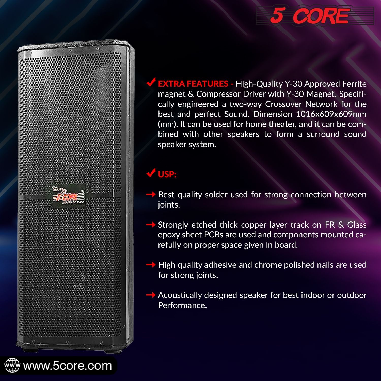 The 5 Core party speakers come with additional features like- High-Quality Y-30 Approved Ferrite magnet & Compressor Driver with Y-30 Magnet. Specifically engineered for the best and perfect Sound. Dimension 352x335x586(mm). The PA speaker system can be used for home theater, and it can be combined with other speakers to form a surround sound speaker system
