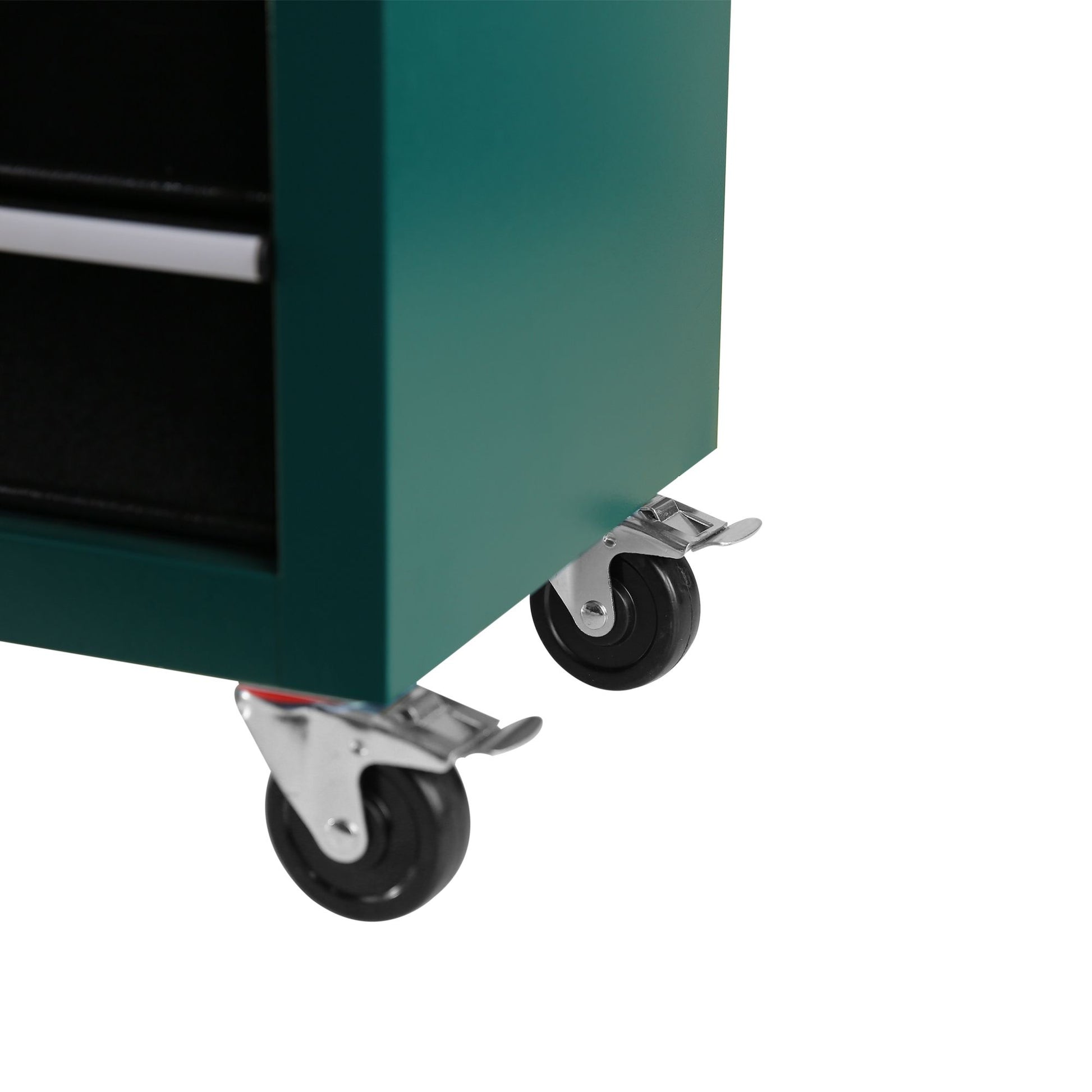 Easy to Move: The bottom has 4 wheels, so it could move easily around work area, 2 swivel casters with brake, the wheels have locking mechanisms to prevent the tool cabinet from moving around on its own while in use. also it comes with a nifty tubular handle for pulling it around.