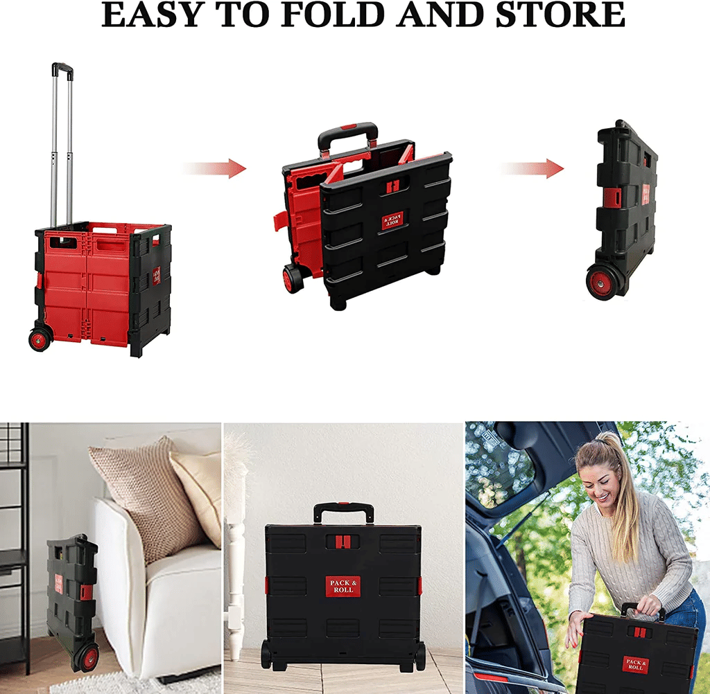 This pack and roll folding shopping and utility crate is a portable unit that folds flat into a compact case for convenient storage. Features smooth-rolling wheels for easy mobility. Use in the workplace, at the shops or for home projects. Ideal for school, grocery, fishing, tailgating, office, moving, shopping, laundry, travel or as a toolbox. Smooth-rolling wheels. Portable unit unfolds and sets up in seconds. Telescopic, aluminum handle with a contoured plastic grip for comfort.