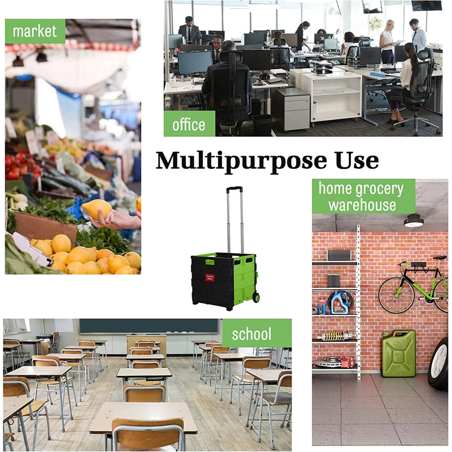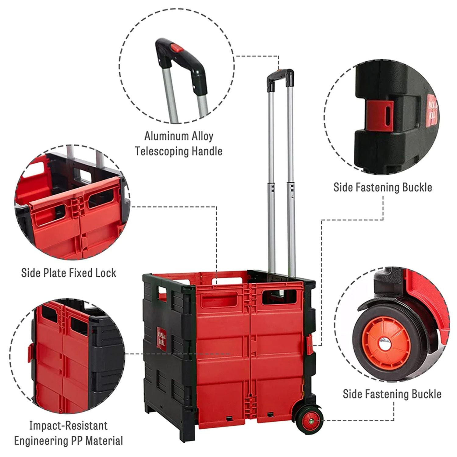 Durable Material for Great Bearing Capacity: Made of impact-resistant PP, the utility cart features better bearing capacity, and is environmentally friendly and lightweight; the Pull handle is made of aluminum, and is rust-proof and flexible. Makes it rugged and durable. The load-bearing capacity is 77 lbs when carrying goods
