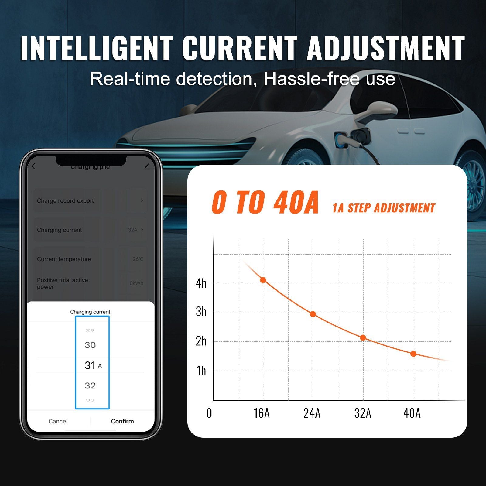 Intelligent Recognition Function: Our EV charging station level 2 can intelligently identify the user's home circuit. If the circuit can not withstand the charging power, it will automatically switch to the appropriate power charging. You won't have anything to worry about! Adjustment Unit: 1A, adjustment Range: 0-40A.